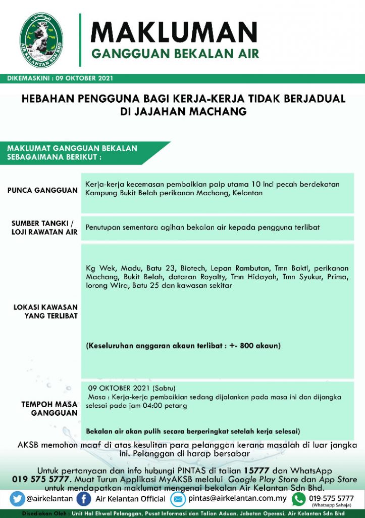 Hebahan Pengguna Bagi Kerja Kerja Tidak Berjadual Di Jajahan Machang Air Kelantan Sdn Bhd Aksb